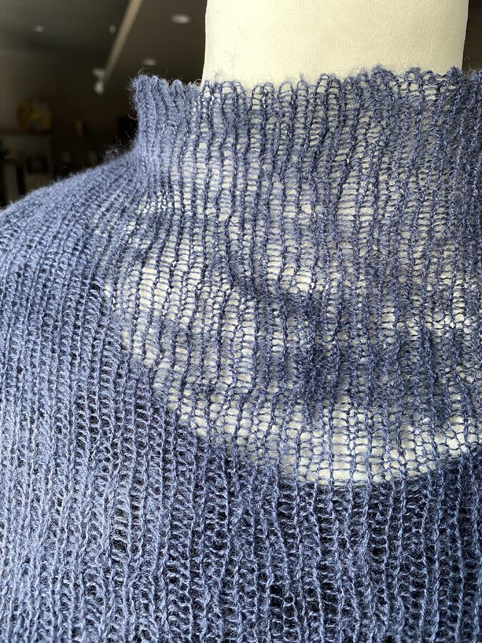 Lisbet på Gotland strikker og Pernilla tover lett i maskin før den sys og farges i etterkant.
