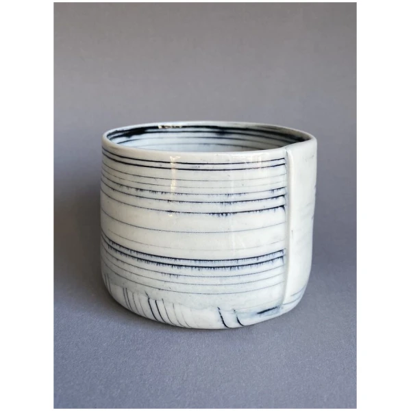 Kopp/beholder laget av innfarget og kjevlet porselen