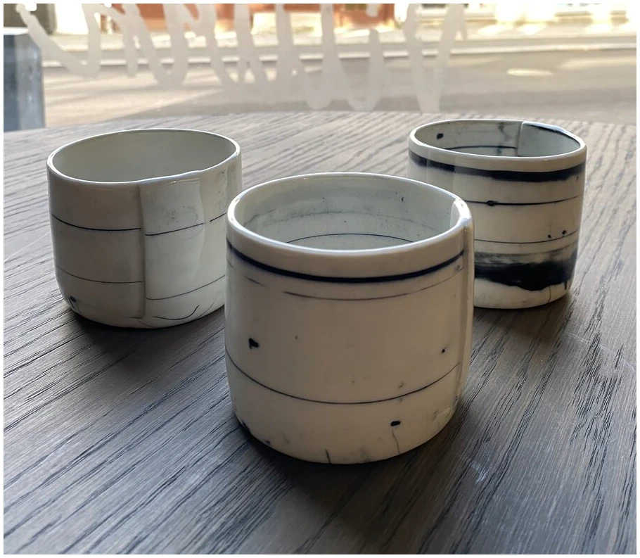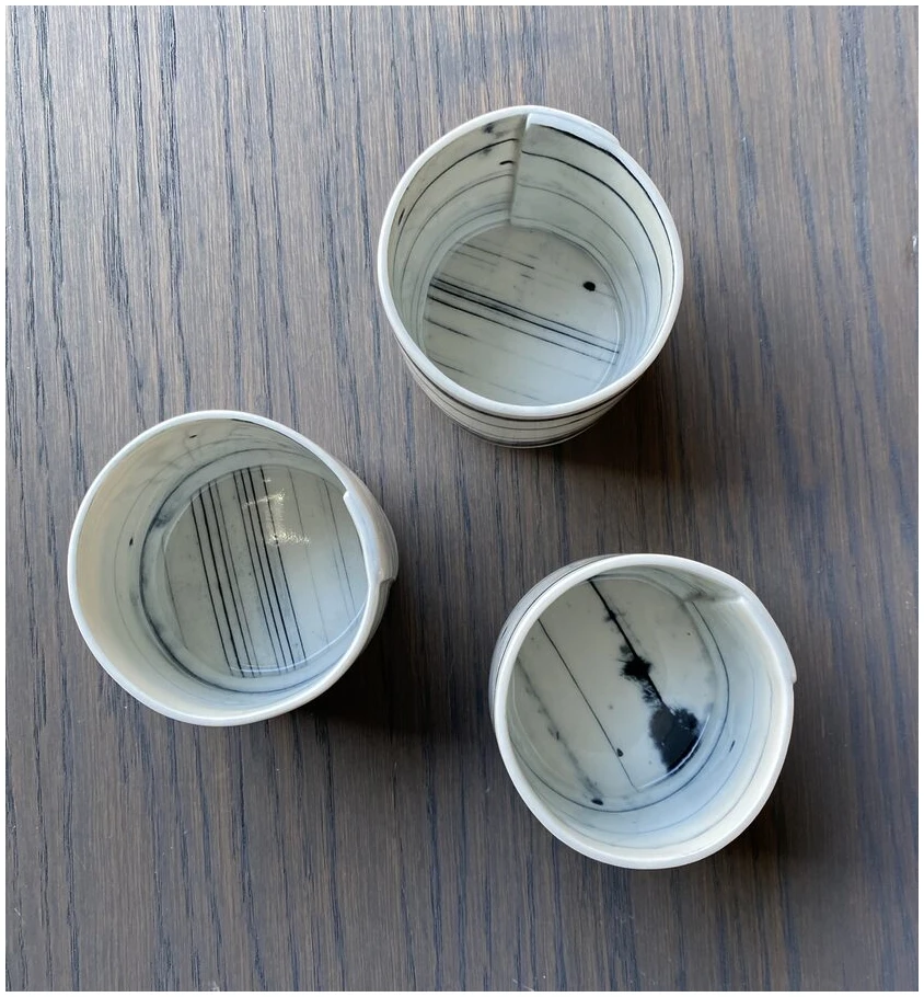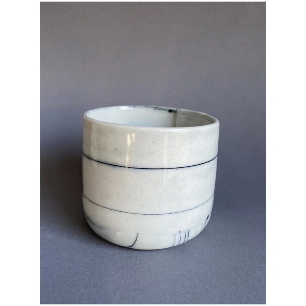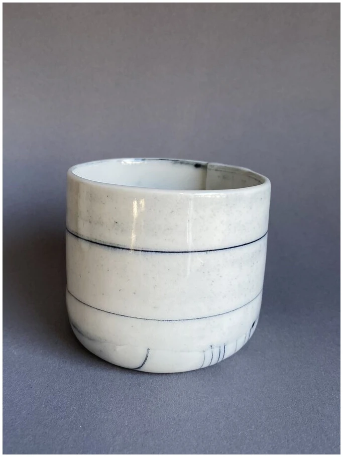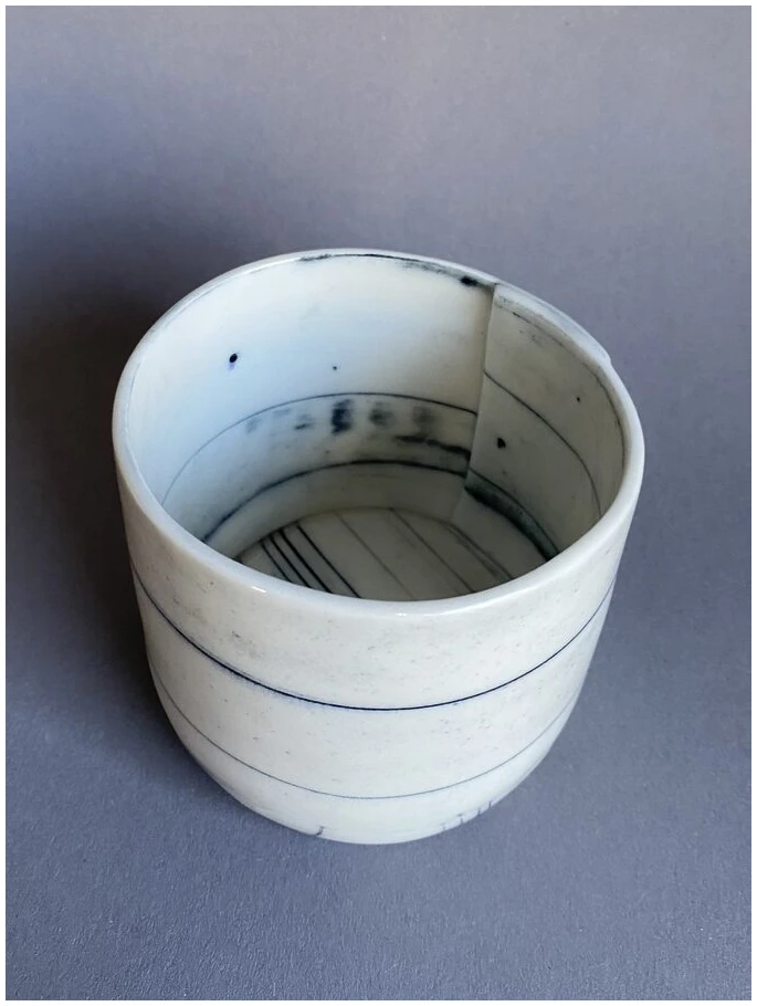 Kopp/beholder laget av innfarget og kjevlet porselen