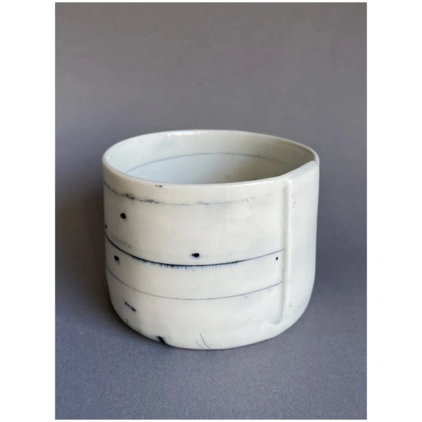Kopp/beholder laget av innfarget og kjevlet porselen
