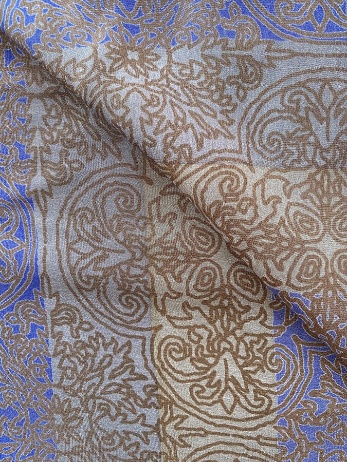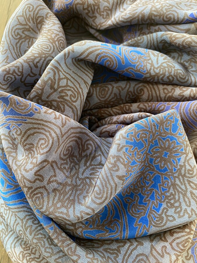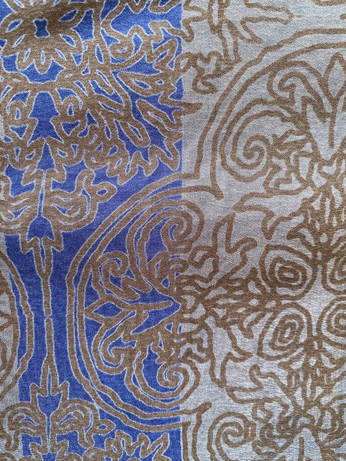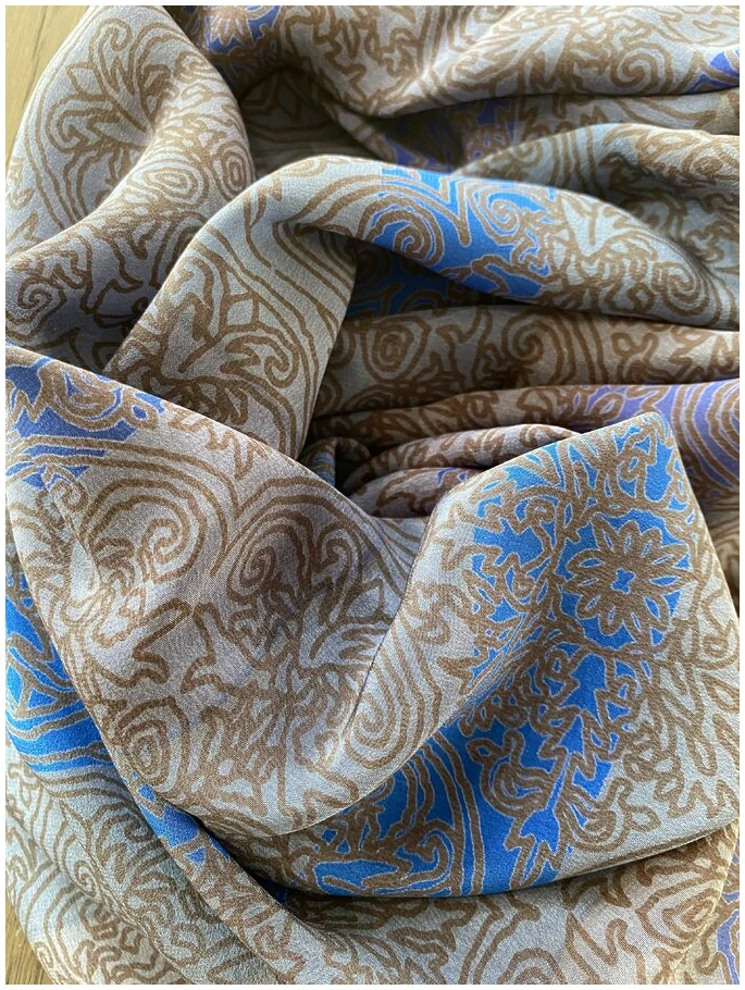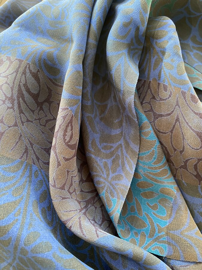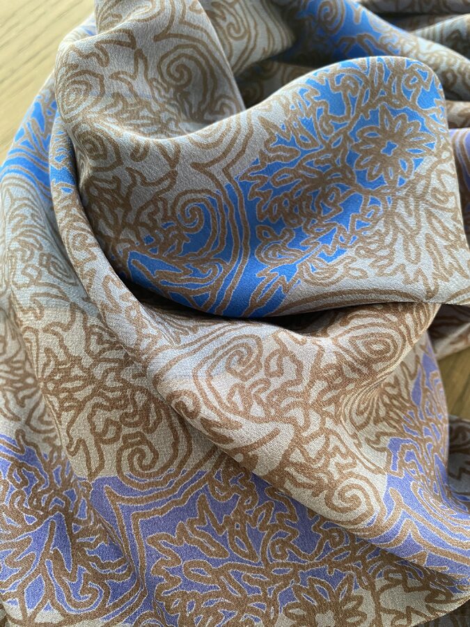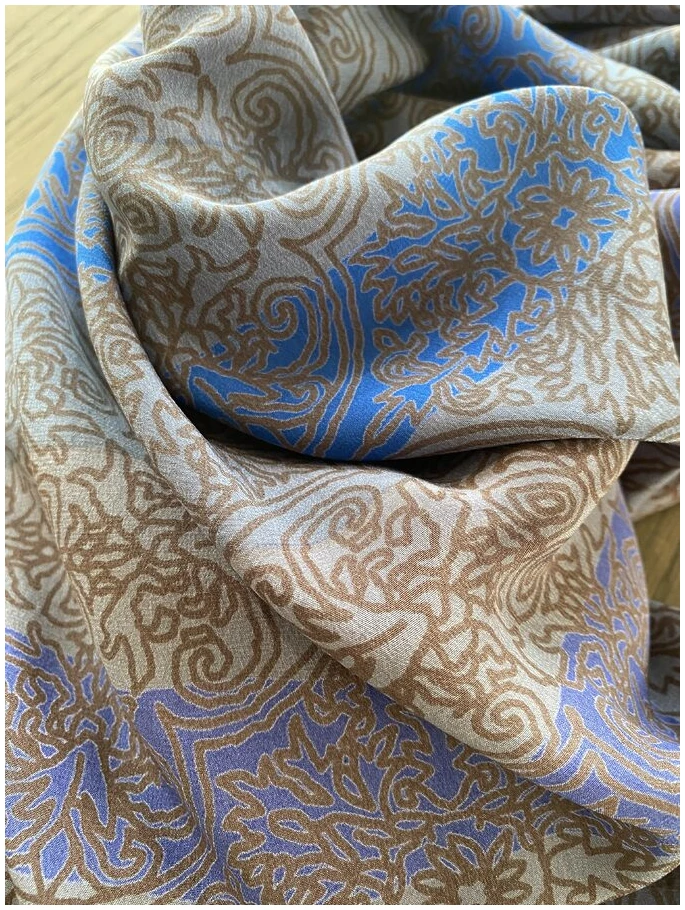 De to produksjonene er helt forskjellige, den eneste likheten er at hun i begge tilfeller arbeider med silketrykk. De store arbeidene utfører Anne Line på lin, mens skjerf og sjal trykkes på ull og silke.