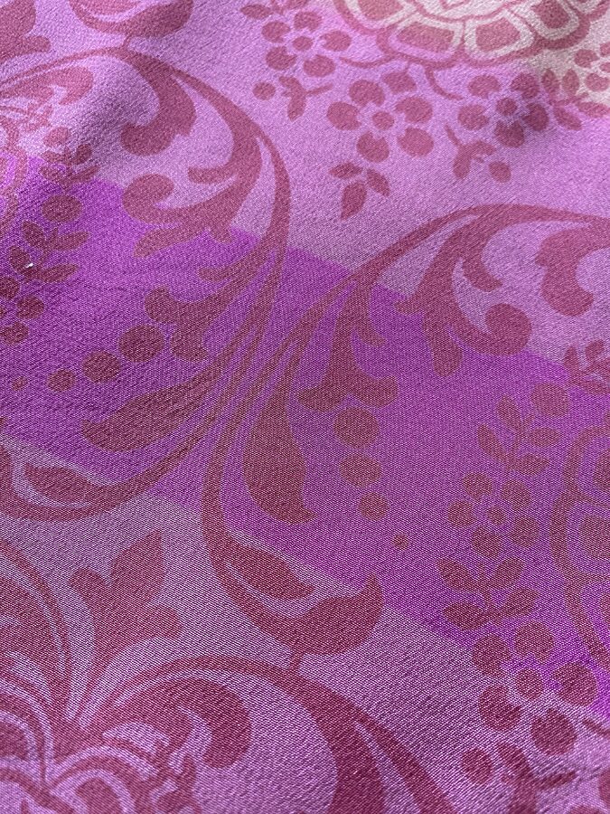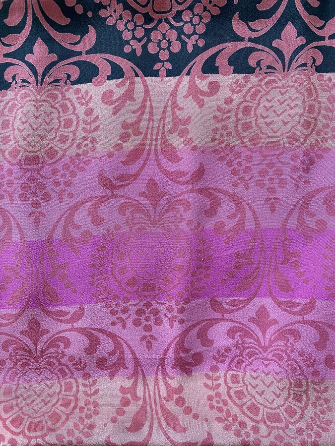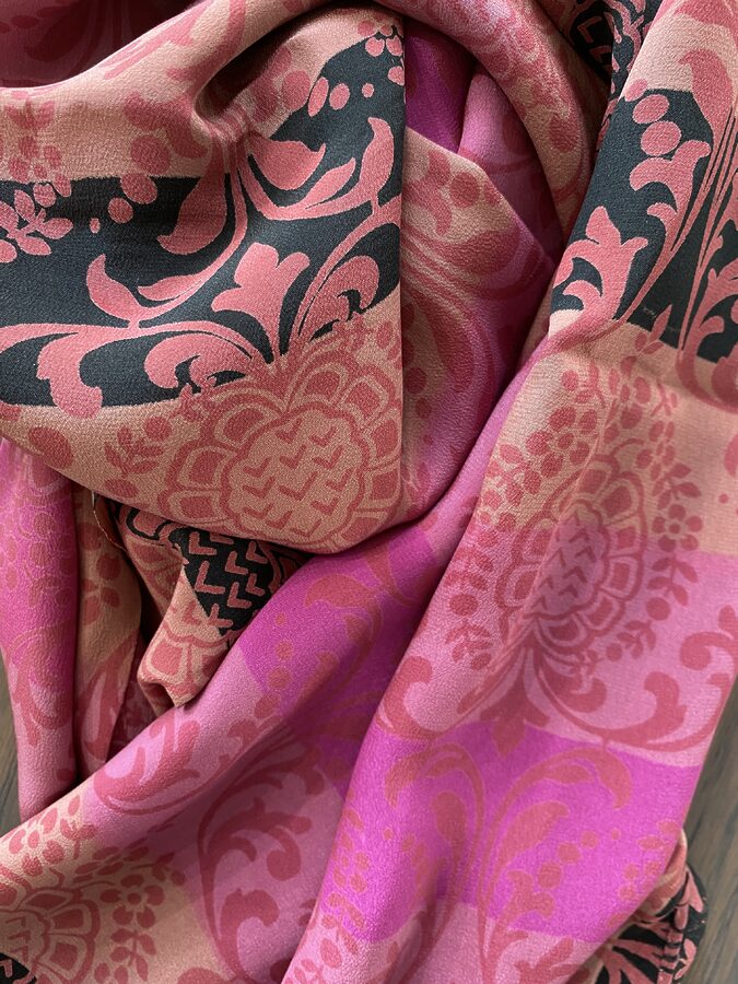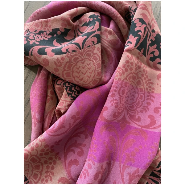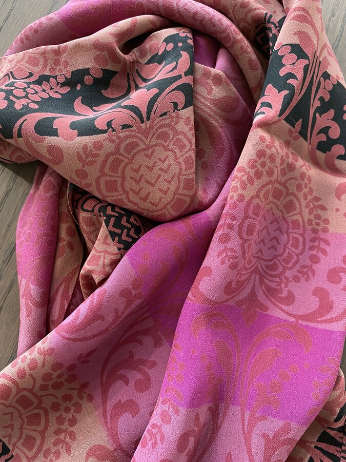 De to produksjonene er helt forskjellige, den eneste likheten er at hun i begge tilfeller arbeider med silketrykk. De store arbeidene utfører Anne Line på lin, mens skjerf og sjal trykkes på ull og silke.
