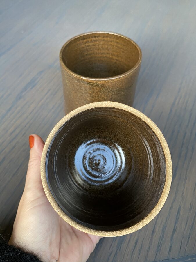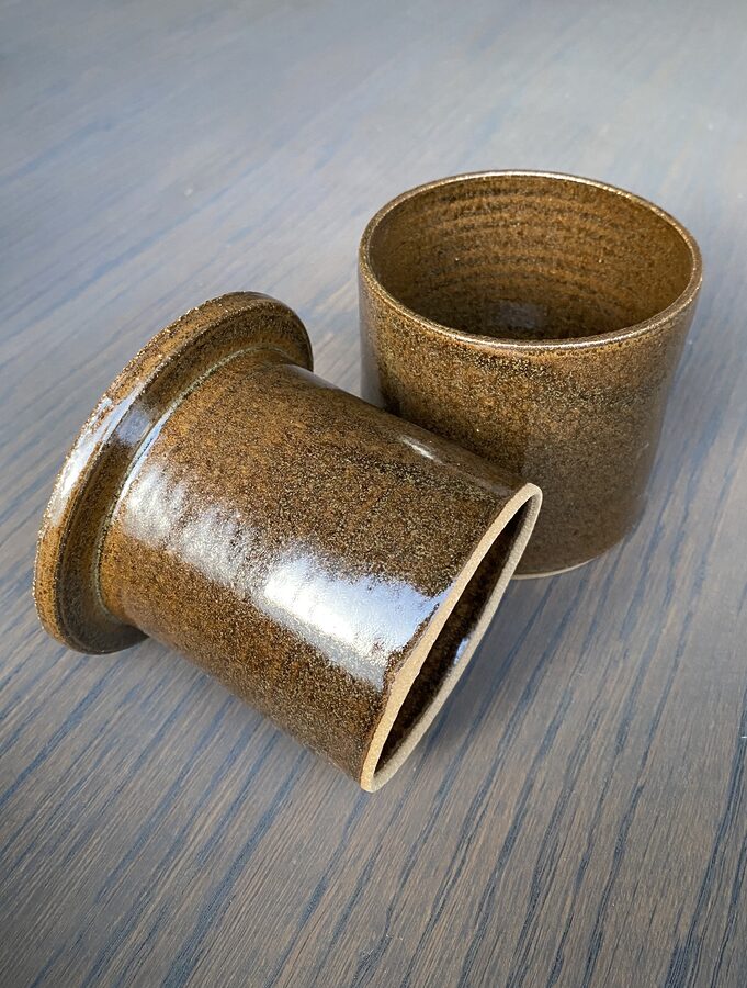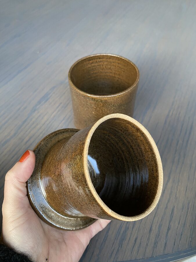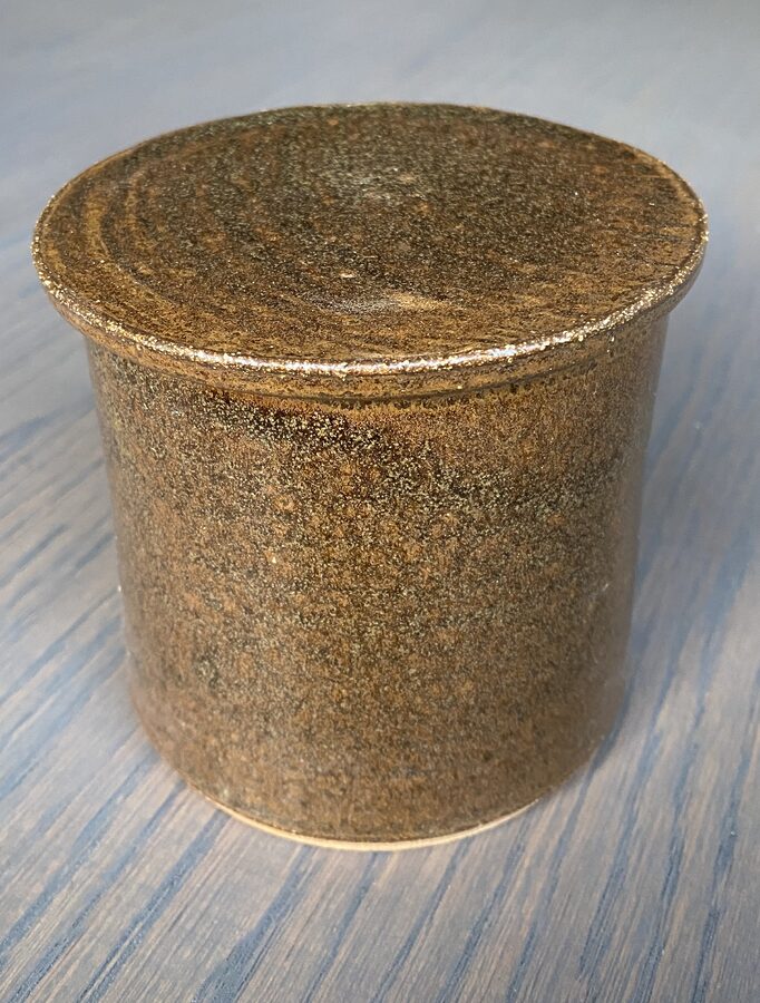Dreiet og hånddekorert krukke til oppbevaring av smør.
