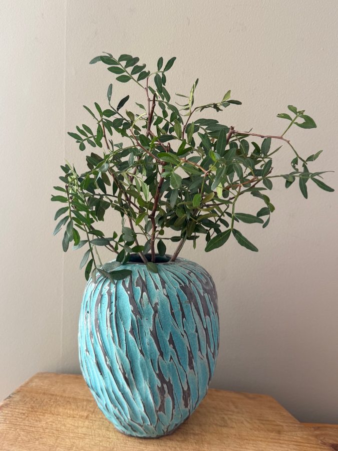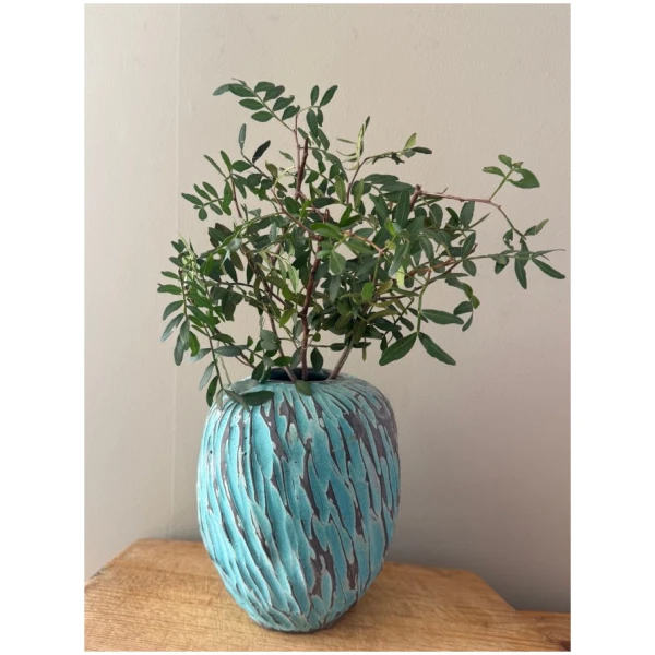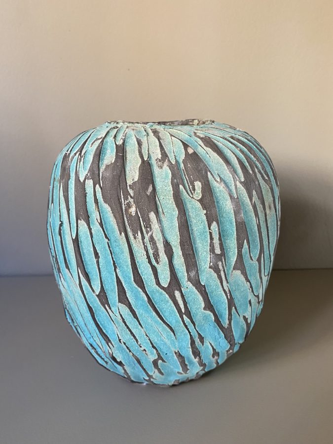 Med en ekte kunstnerisk ånd eksperimenterer Gunvor fritt med materialer, farger, former og metoder. Dypt inspirert av den ville naturen rundt seg, innlemmer hun ofte lokalt hentet leire, sand og stein i arbeidet sitt.